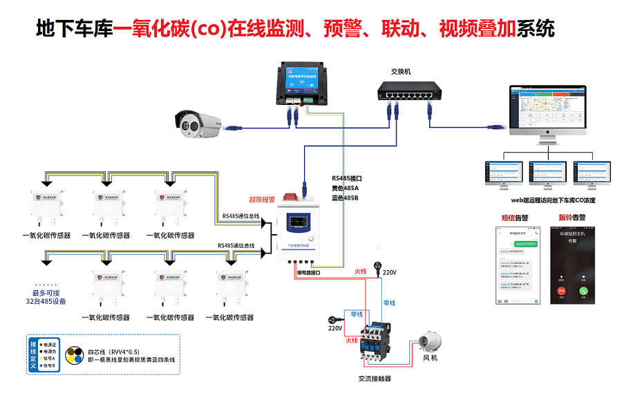 地(di)下(xia)車庫一(yi)氧化碳(tan)(CO)在(zai)線監測(ce)、預警、聯動、視(shi)頻(pin)疊加(jia)一(yi)體化系(xi)統主(zhu)要(yao)由一(yi)氧化碳(tan)濃(nong)度采集系(xi)統,一(yi)氧化碳(tan)濃(nong)度報警、控(kong)制(zhi)系(xi)統,地(di)下(xia)車庫視(shi)頻(pin)監控(kong)系(xi)統以及綜合環(huan)境(jing)監控(kong)云平臺(tai)組成。