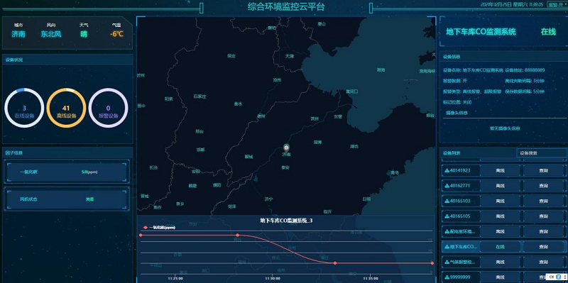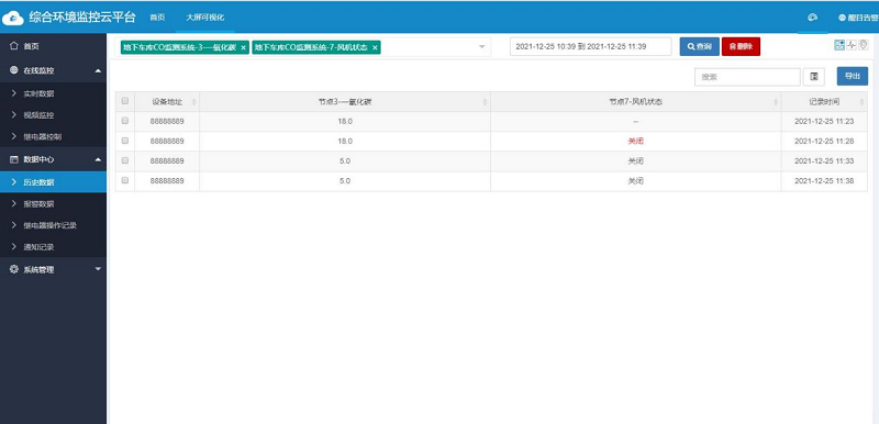 地下(xia)車庫一氧(yang)化碳(CO)在(zai)線監(jian)測、預(yu)警、聯動風機、視(shi)頻疊加一體化系統中的(de)數(shu)據(ju)(ju)均由綜合(he)環境監(jian)控云平臺處(chu)理。在(zai)軟件(jian)頁面中,支(zhi)持樹形(xing)結(jie)構展示,支(zhi)持在(zai)線設備、報(bao)警設備、離線設備快速篩選。可通過快捷方式快速查(cha)看、修改(gai)設備信息,查(cha)詢實時、歷(li)史、報(bao)警數(shu)據(ju)(ju),支(zhi)持數(shu)據(ju)(ju)曲線分析,并提供數(shu)據(ju)(ju)的(de)下(xia)載(zai)分析功(gong)能。