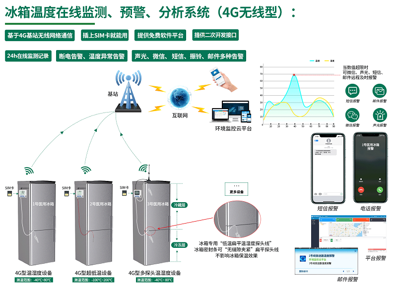 所有溫度監測終端設備采用4G網絡信號傳輸實現24小時獨立冰箱溫度監控或遠程冰箱溫度監控,同時能對大面積的多點溫度/濕度進行監測,并將數據傳輸到云平臺進行數據存儲分析。
