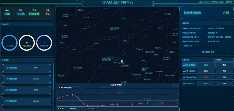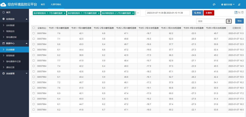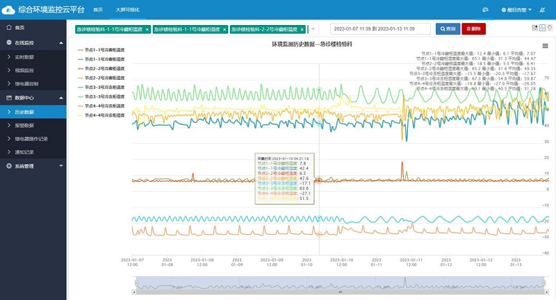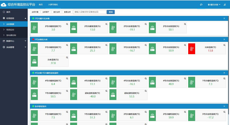 增加大屏可視化一覽表,快速查詢任意一臺設備具體實時信息。可投屏顯示,自動刷新,集中滾動顯示各監測點的環境溫度監測數據,實時展現冰箱不同區域位置溫度等關鍵數據的動態曲線,數據清晰、直觀,便于管理人員進行系統查看。