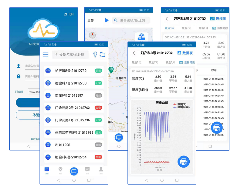 各級管理人員可憑賬號密碼在PC電腦端、手機APP端登錄云平臺遠程查看溫度實時數據、設備實時情況等信息;同時各路溫濕度記錄儀自帶液晶顯示屏,實時顯示當前溫濕度值、電池電量、網絡信號狀態、存儲數量、時間等信息,管理人員可直接在現場查看各項數據。