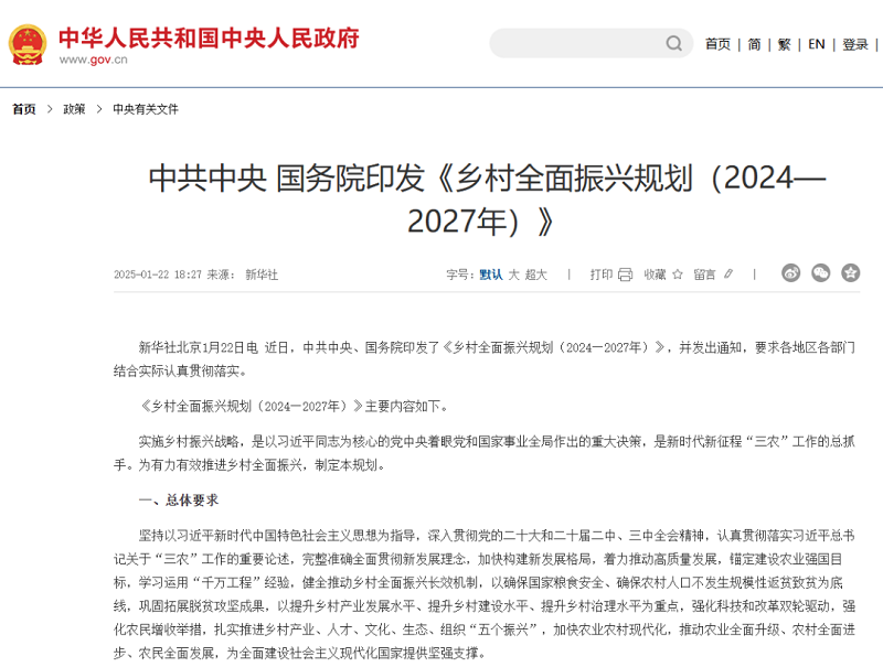 中共中央、國務院也于近日印發了《鄉村全面振興規劃(2024—2027年)》,并發出通知,要求各地區各部門結合實際認真貫徹落實。
